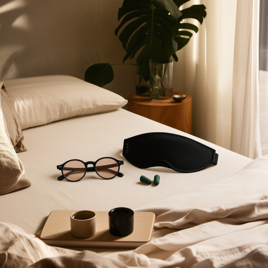 Light, sound, the signal your body receives as evening falls. A mask that blocks everything out. Earplugs that let the silence in. Glasses that tell your brain the day is done. Small, deliberate choices that prepare you for what comes next.